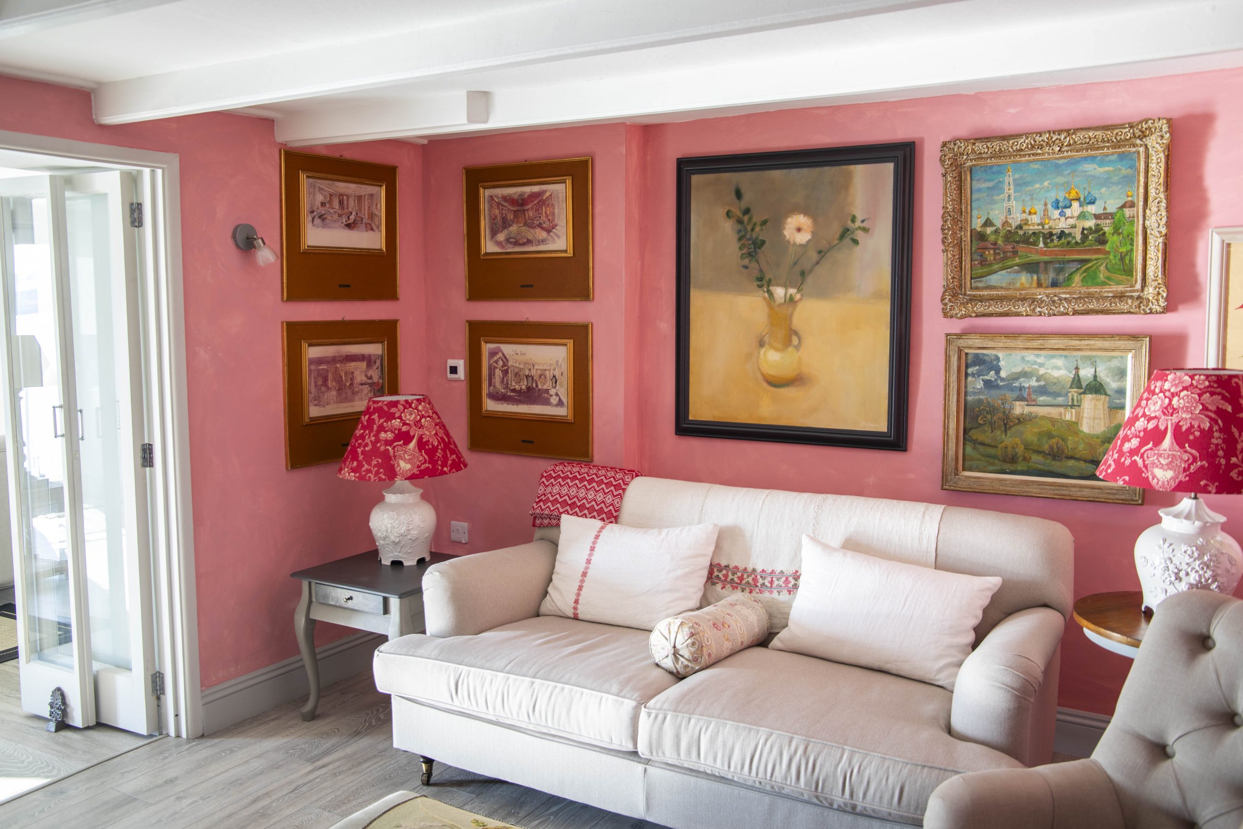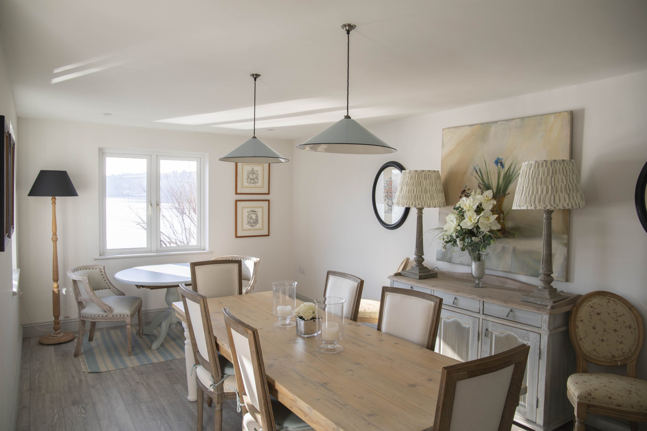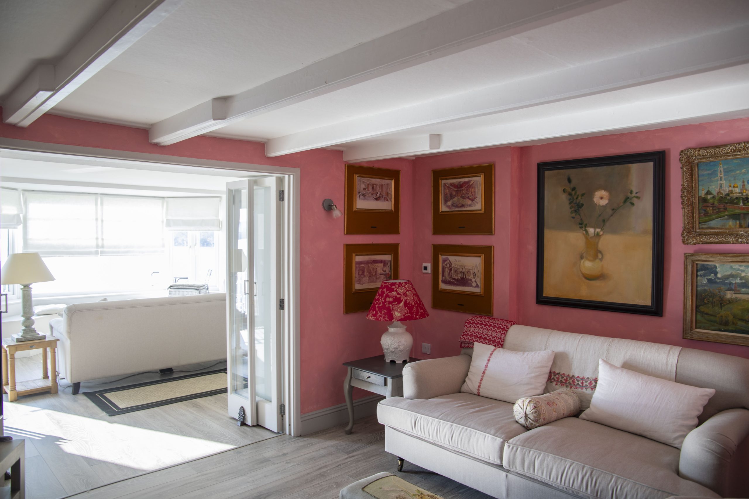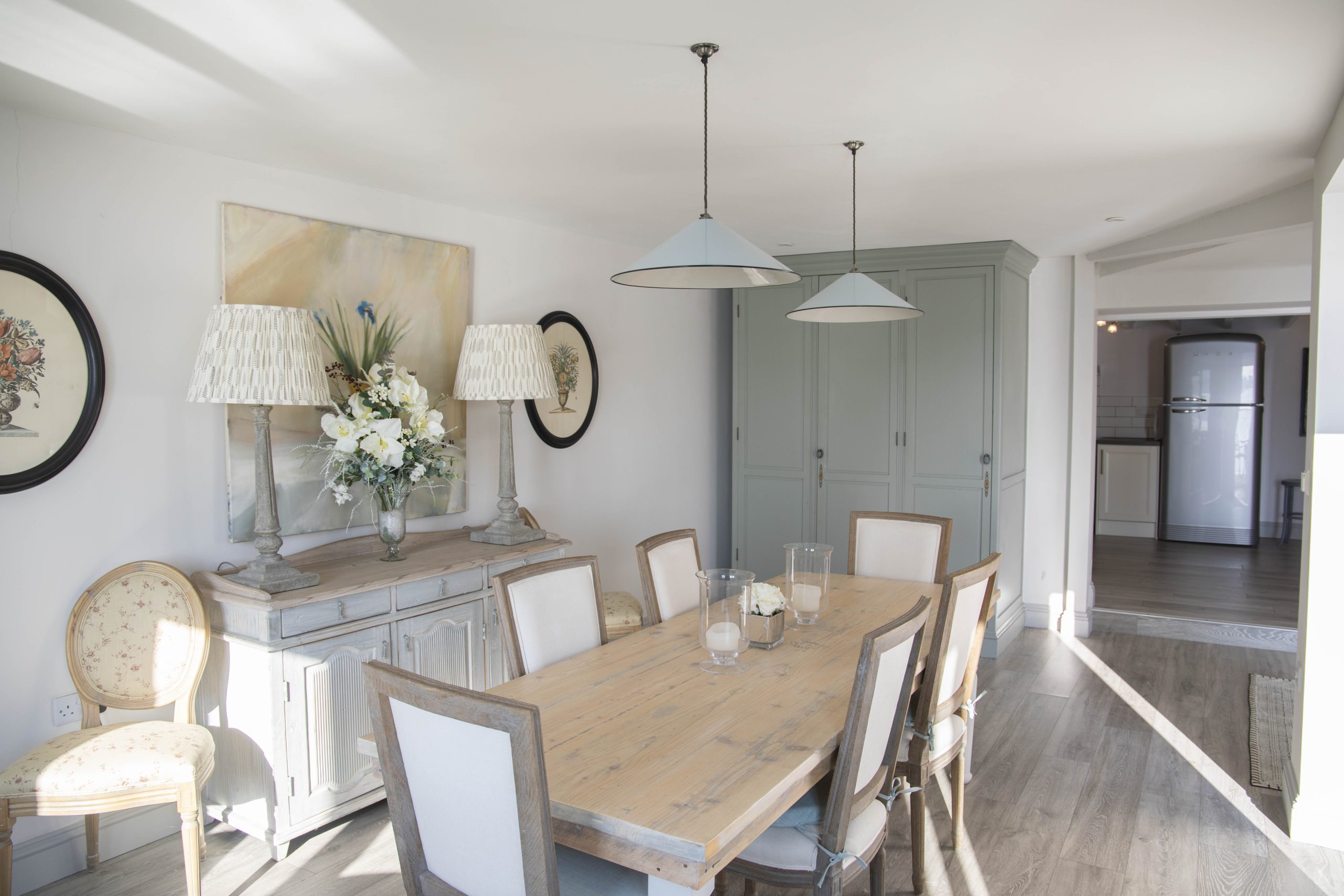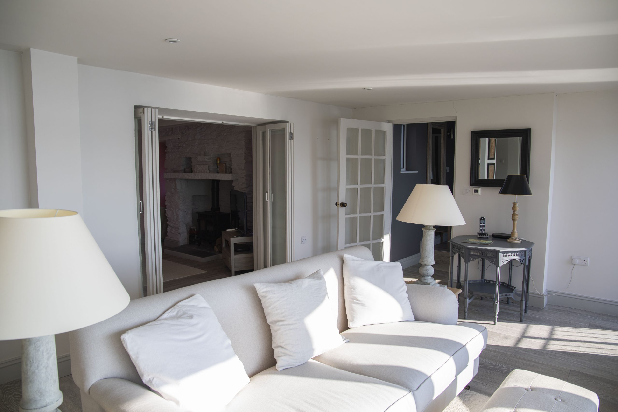 On arrival, you are welcomed into a spacious hallway. To the right, the main sitting room offers panoramic creek views and opens onto the waterside garden terrace. Behind it, a charming pink snug with a wood-burning stove and television provides the perfect hideaway for quieter moments. Further along, the dining area leads to a fully equipped modern kitchen, complete with a Range Master stove, large SMEG fridge, dishwasher, washing machine, and tumble dryer.