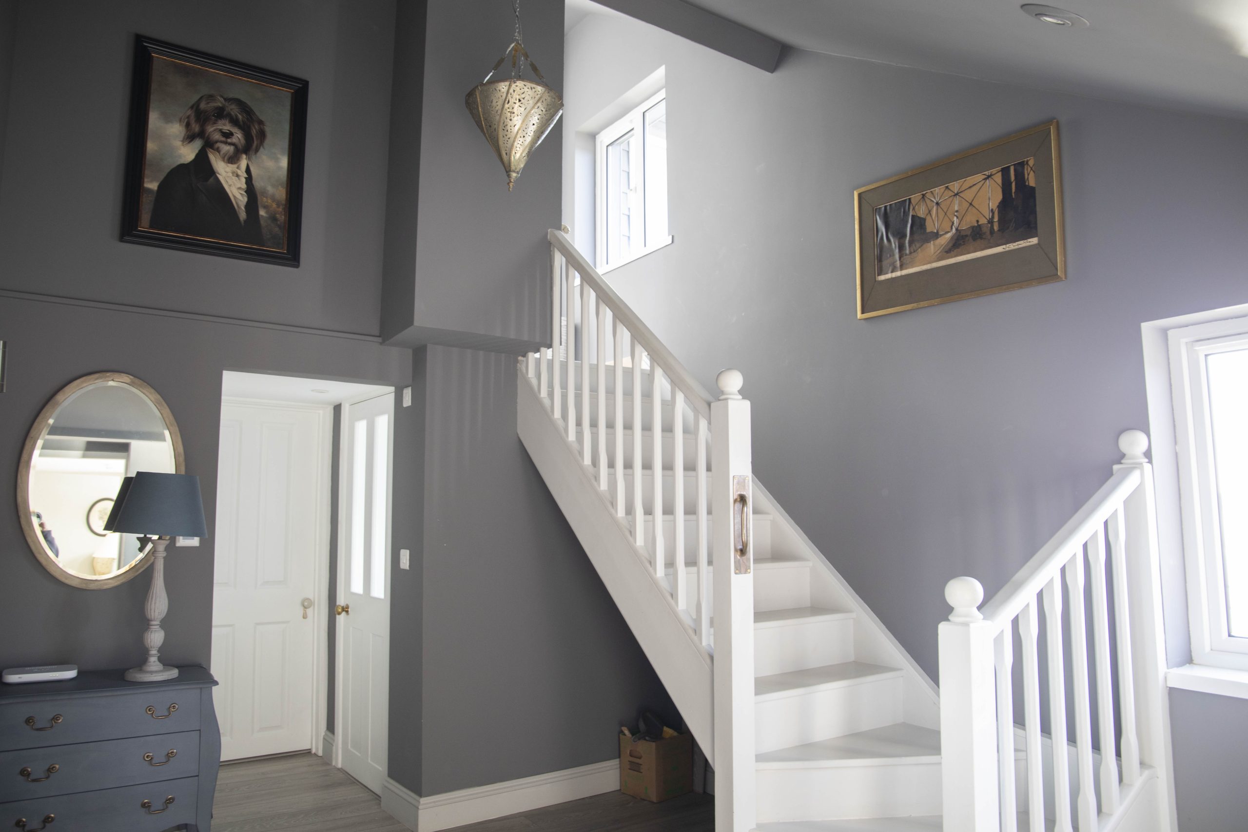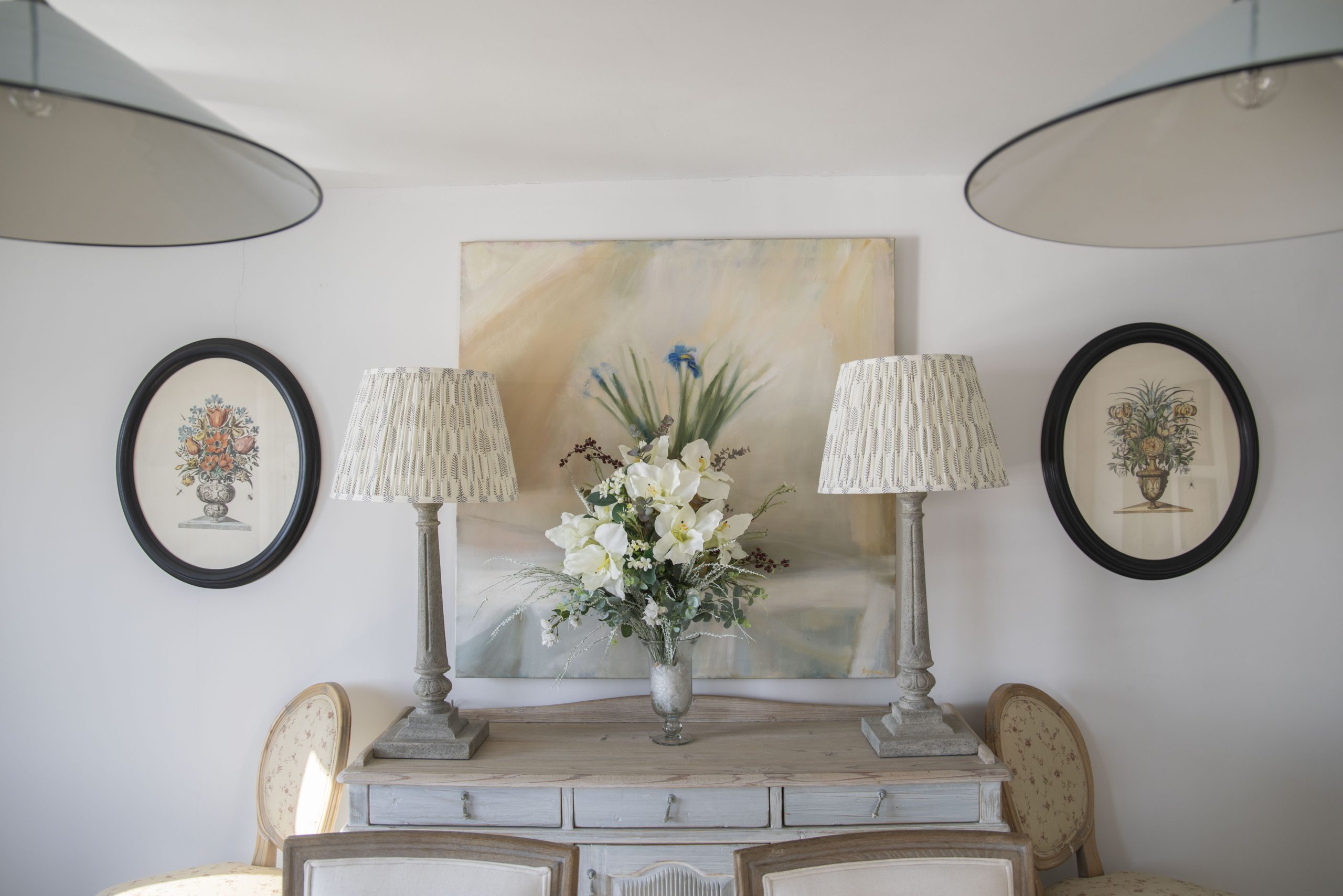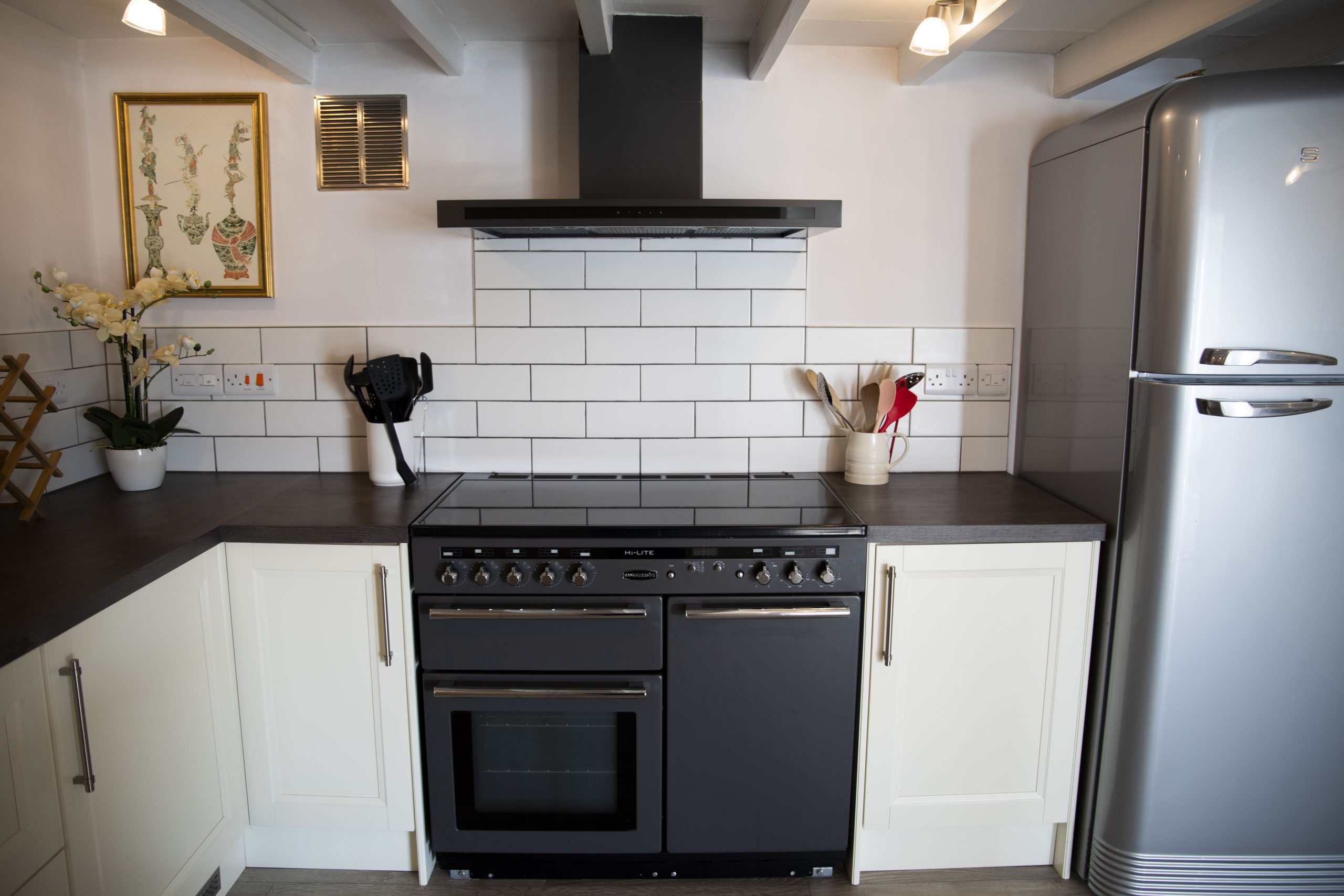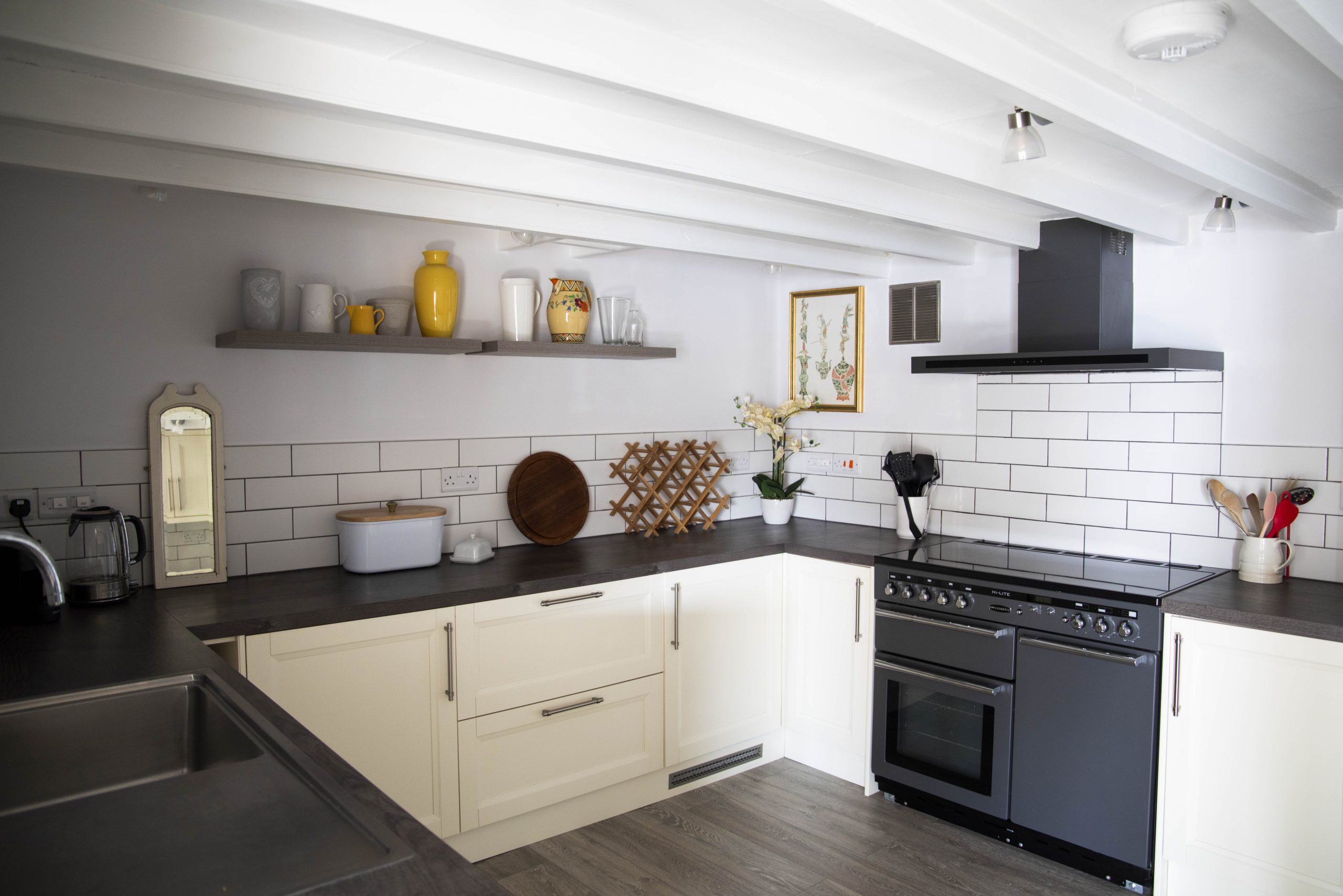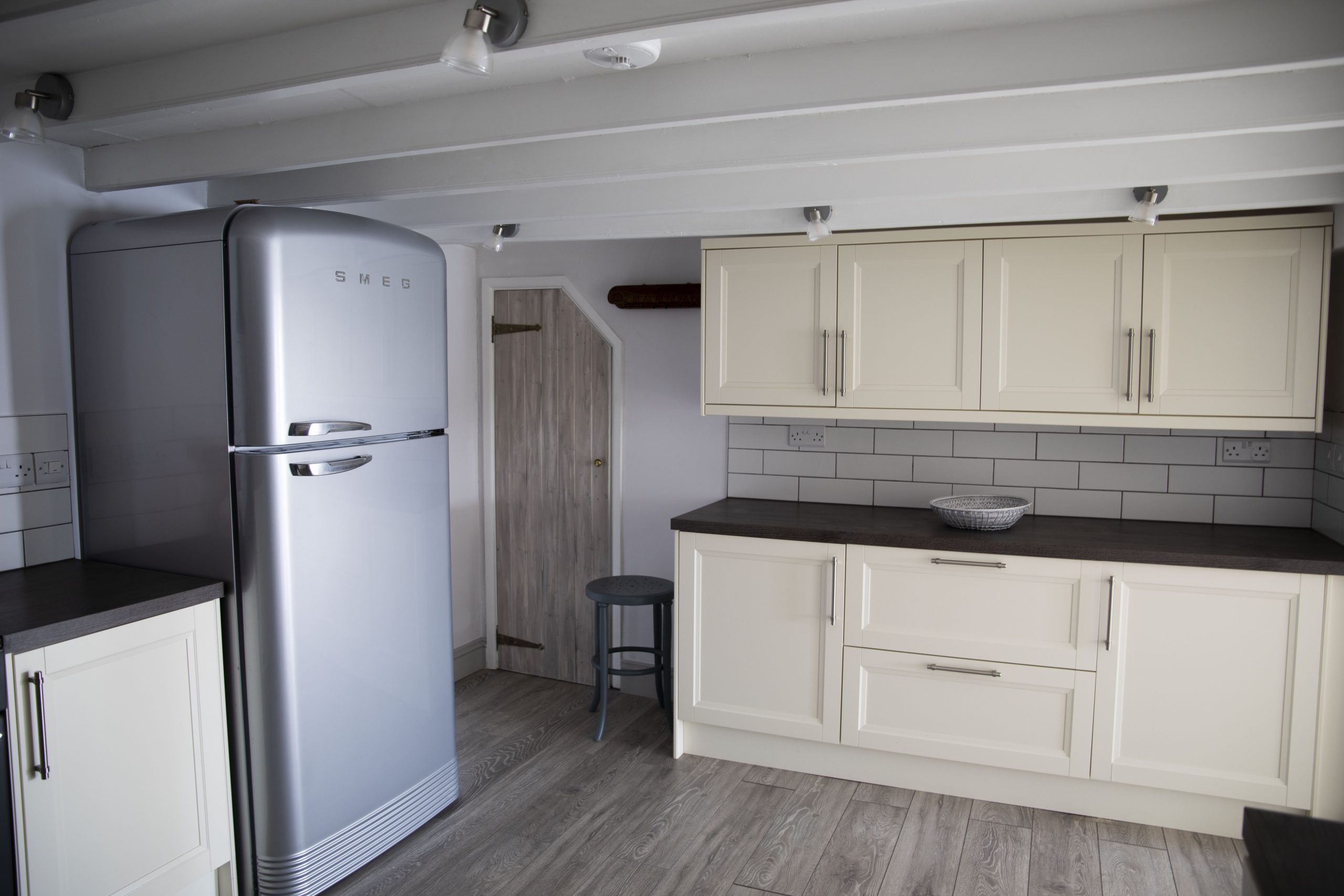 On arrival, you are welcomed into a spacious hallway. To the right, the main sitting room offers panoramic creek views and opens onto the waterside garden terrace. Behind it, a charming pink snug with a wood-burning stove and television provides the perfect hideaway for quieter moments. Further along, the dining area leads to a fully equipped modern kitchen, complete with a Range Master stove, large SMEG fridge, dishwasher, washing machine, and tumble dryer.