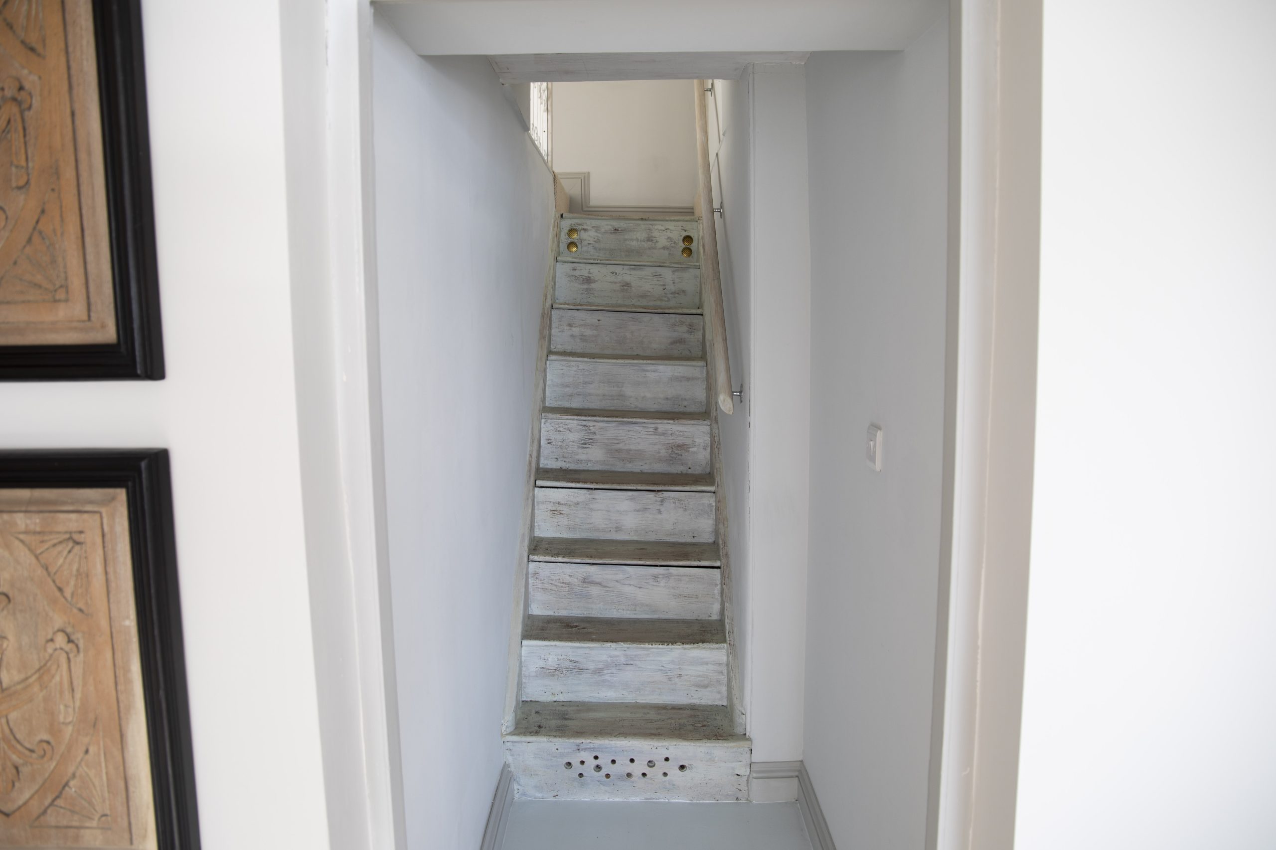 On the other side of the front hall, is a ground-floor toilet and stairs lead to a cozy double bedroom with stunning creek views, accompanied by a shower room with a toilet and washbasin.