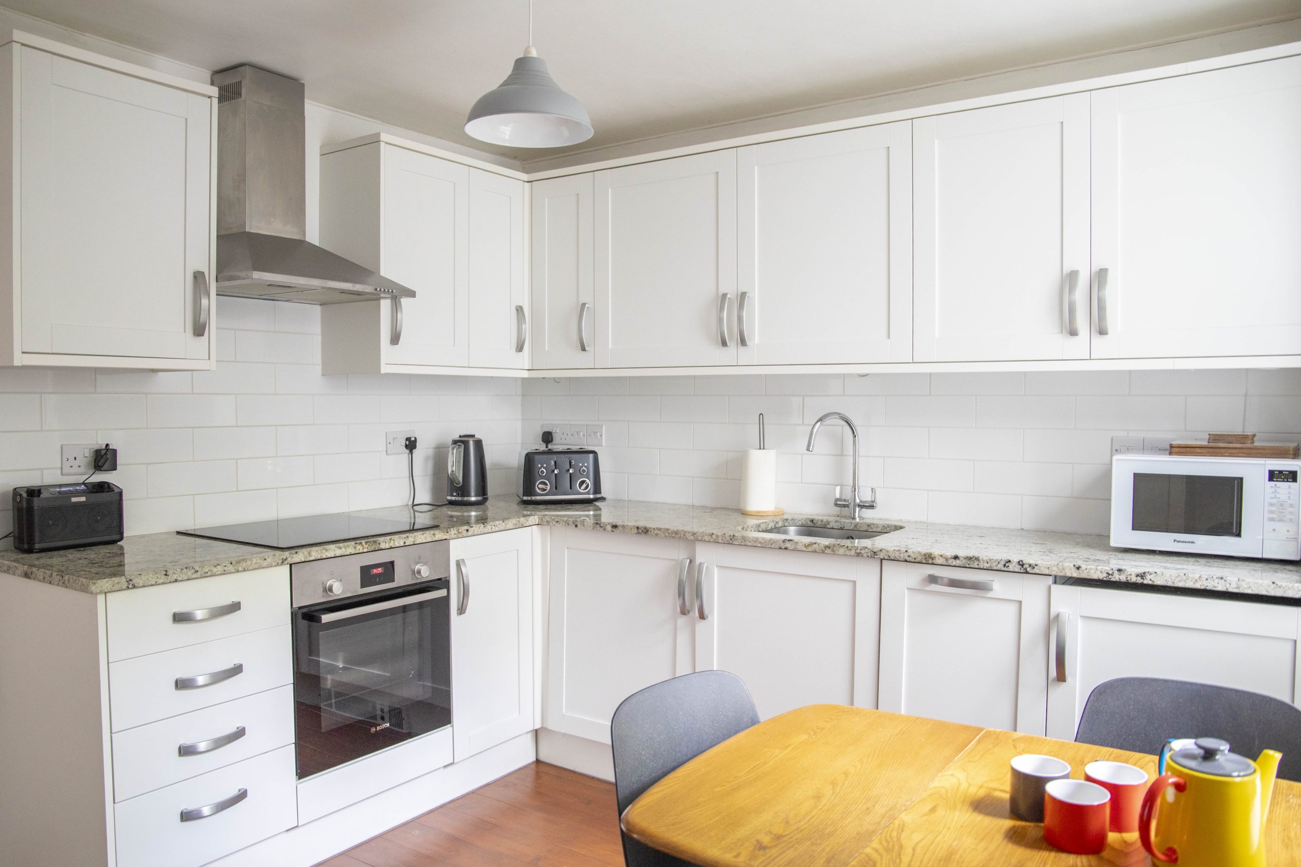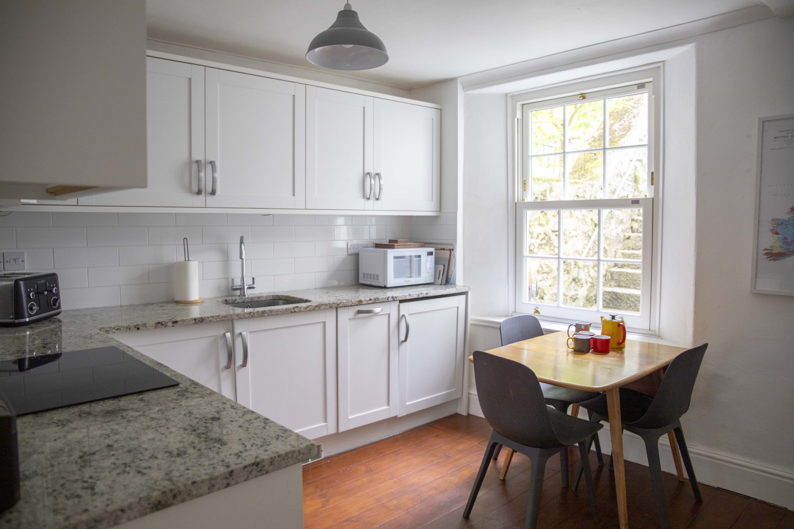 The entrance hallway has beautiful parquet-style timber flooring, leading to the sitting room, which contains slate flag-style flooring with a television, a cosy wood burner, and exposed stonework walls. The kitchen has shaker-style white units with polished granite work surfaces, a single electric oven, a ceramic hob, a fridge/freezer, a dishwasher, a microwave and a dining table.