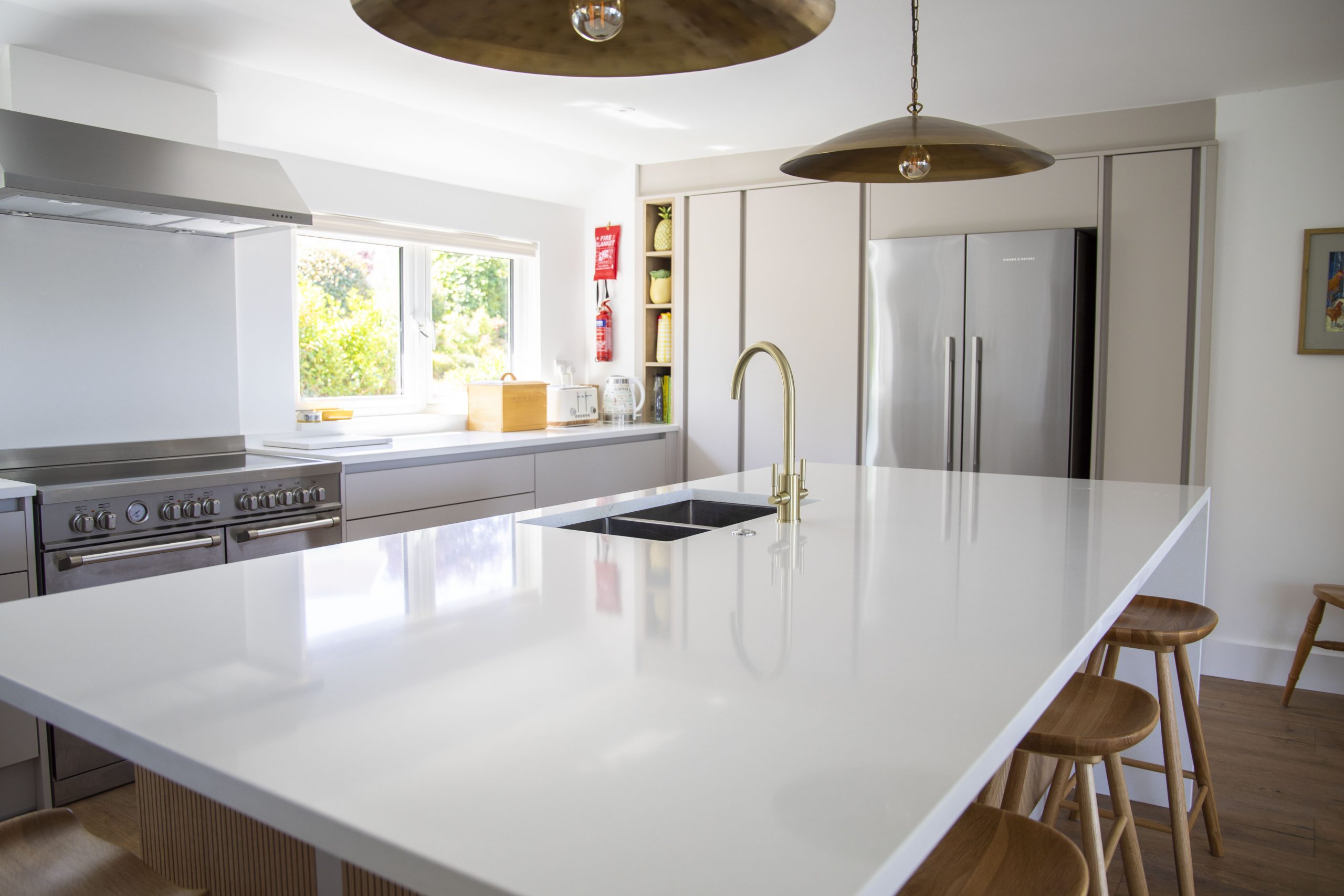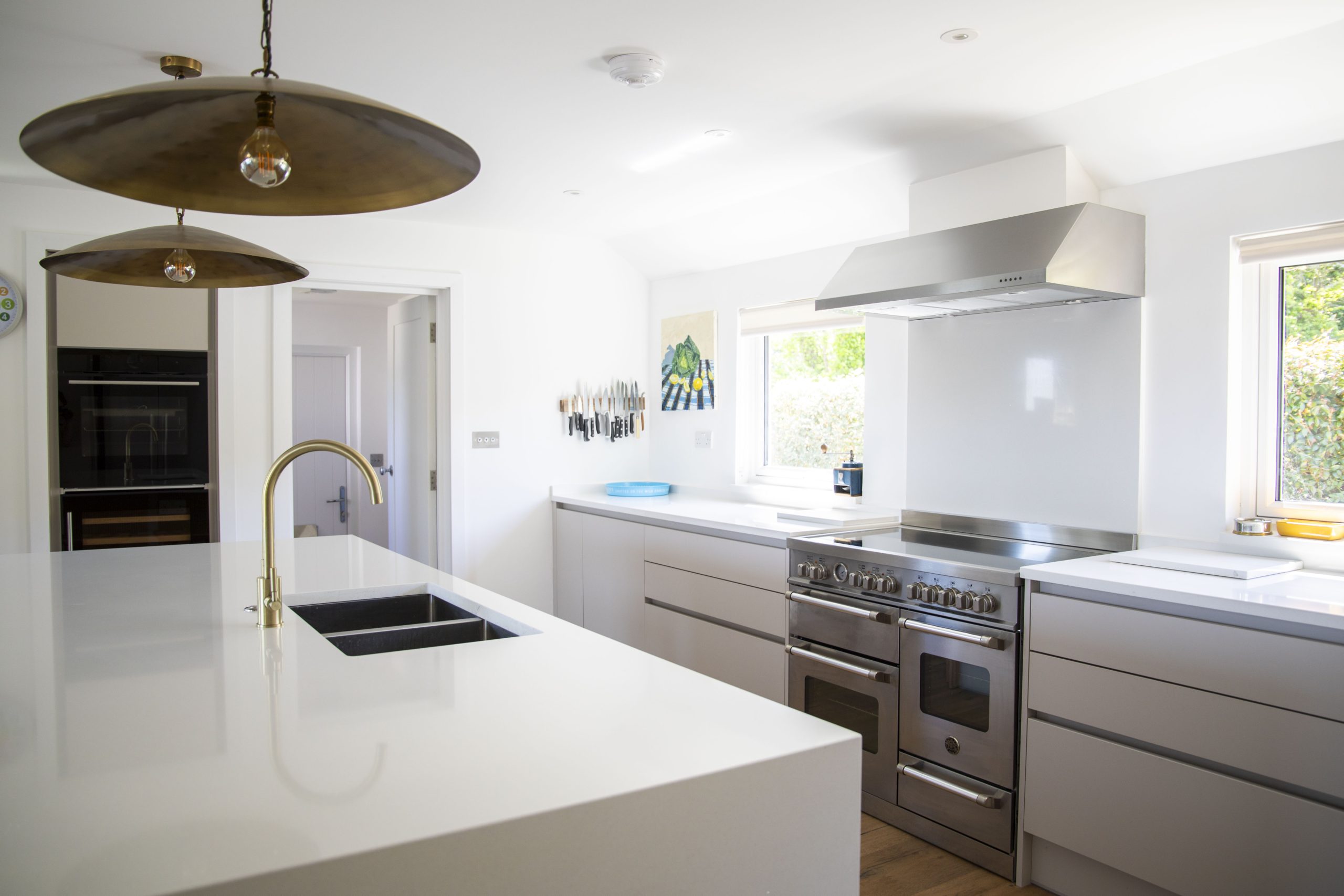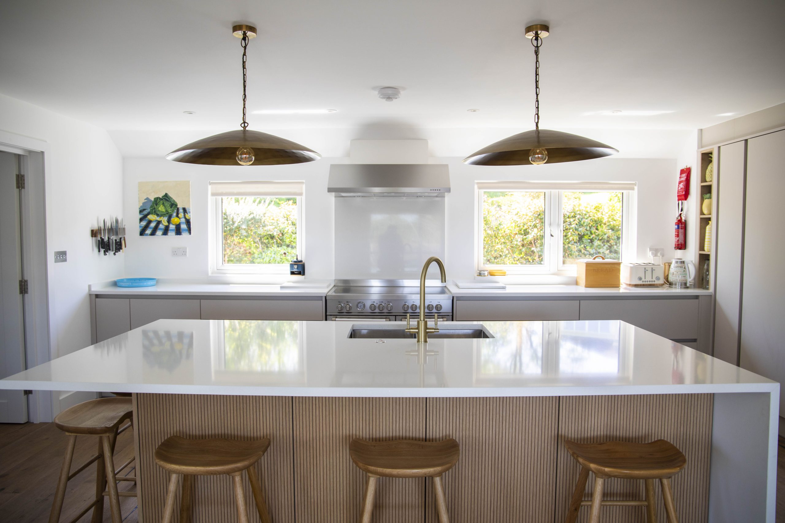 This contemporary fully fitted and equipped kitchen has a large Bertazzoni electric range cooker, a Fisher & Pykle Fridge freezer, a Bosch Steam oven with Air Fryer, two Miele dishwashers and a wine fridge.