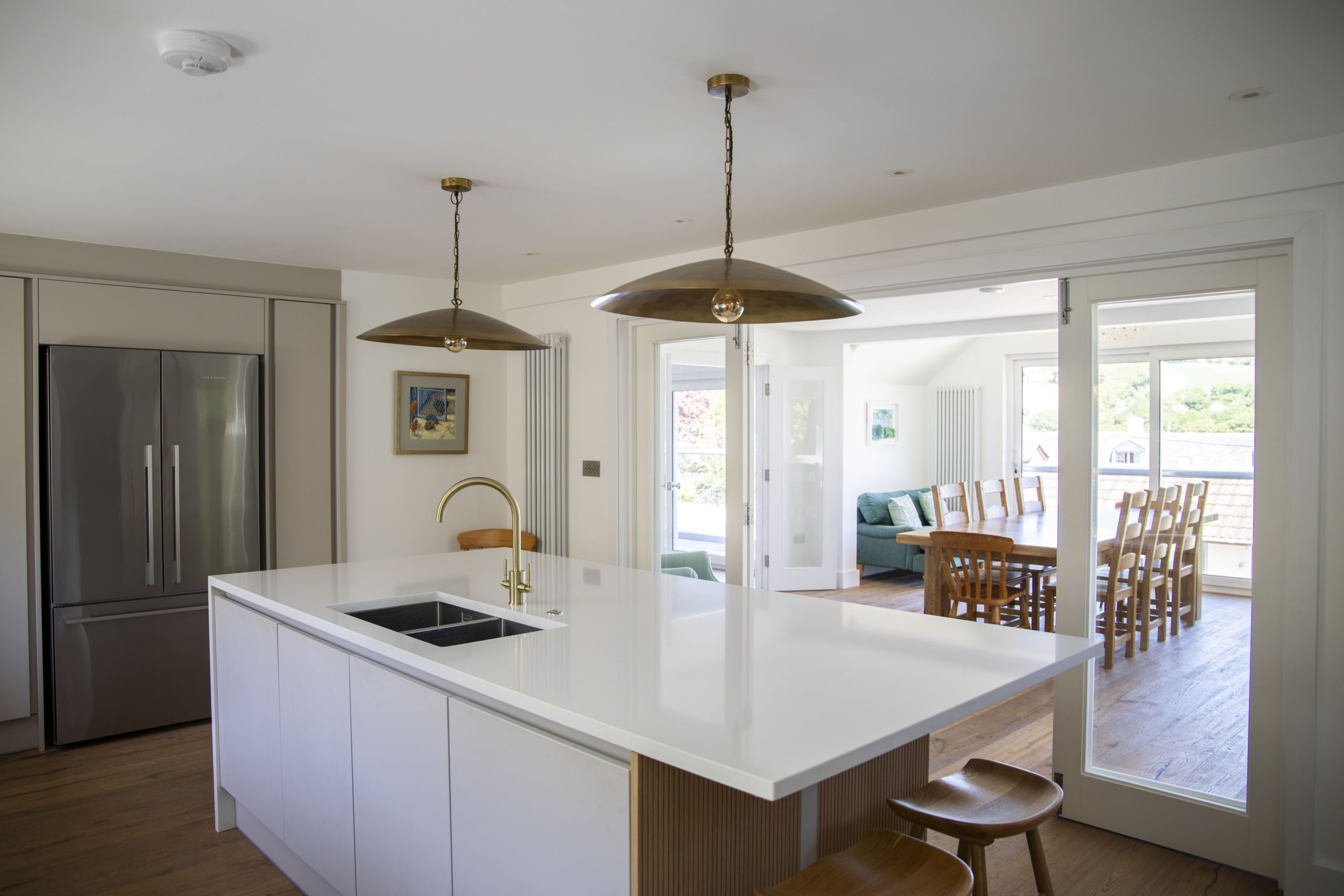 On the other side of the landing you walk through the spacious main sitting room with a wood-burning stove, beyond this the large kitchen dining room with views out over the harbour.