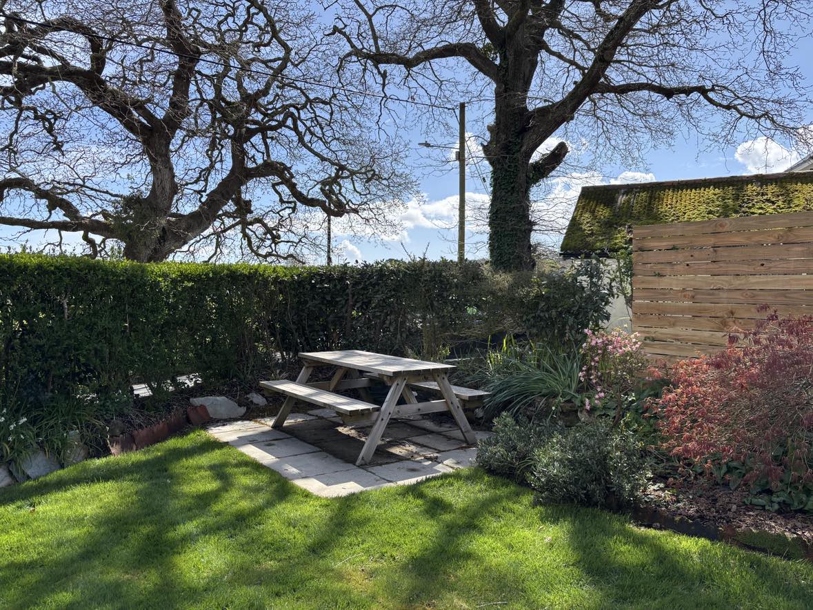 Outside, the beautifully landscaped garden features a decked area with a table and chairs — perfect for al fresco dining or evening barbecues. The lawn, complete with a picnic table, provides an additional space to relax and soak in the peaceful surroundings. A private driveway offers convenient parking for one car.