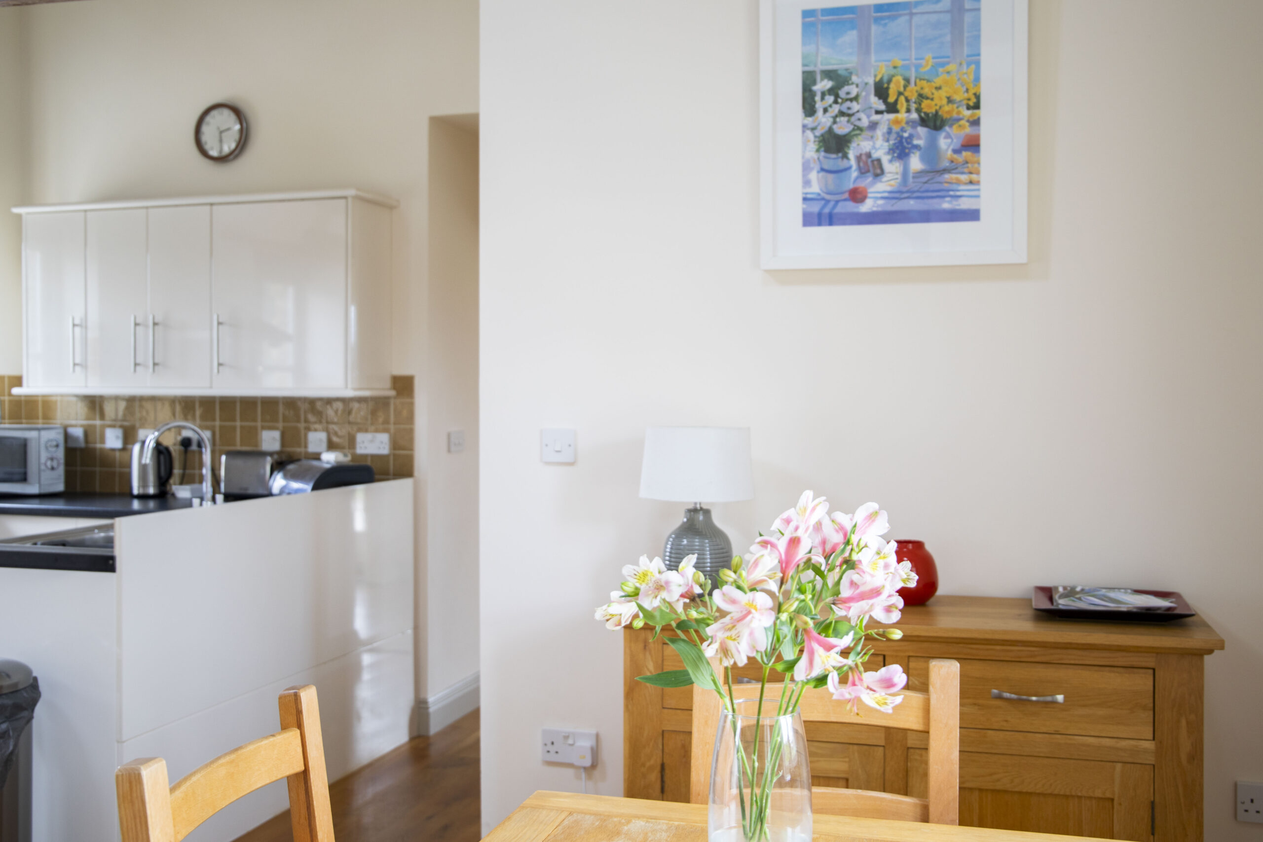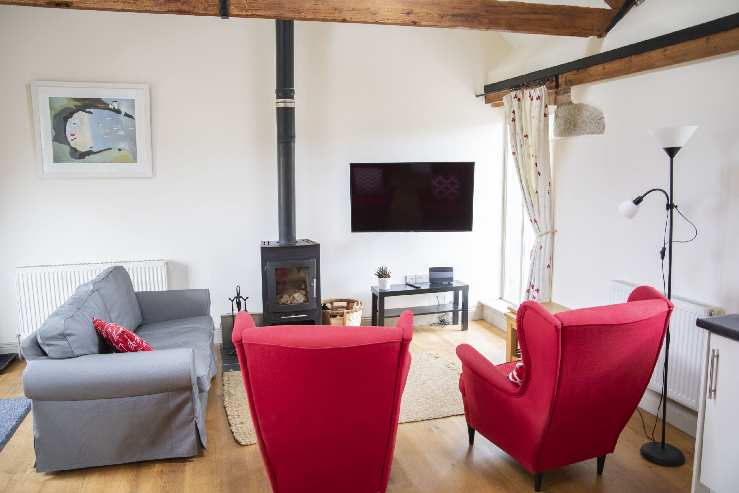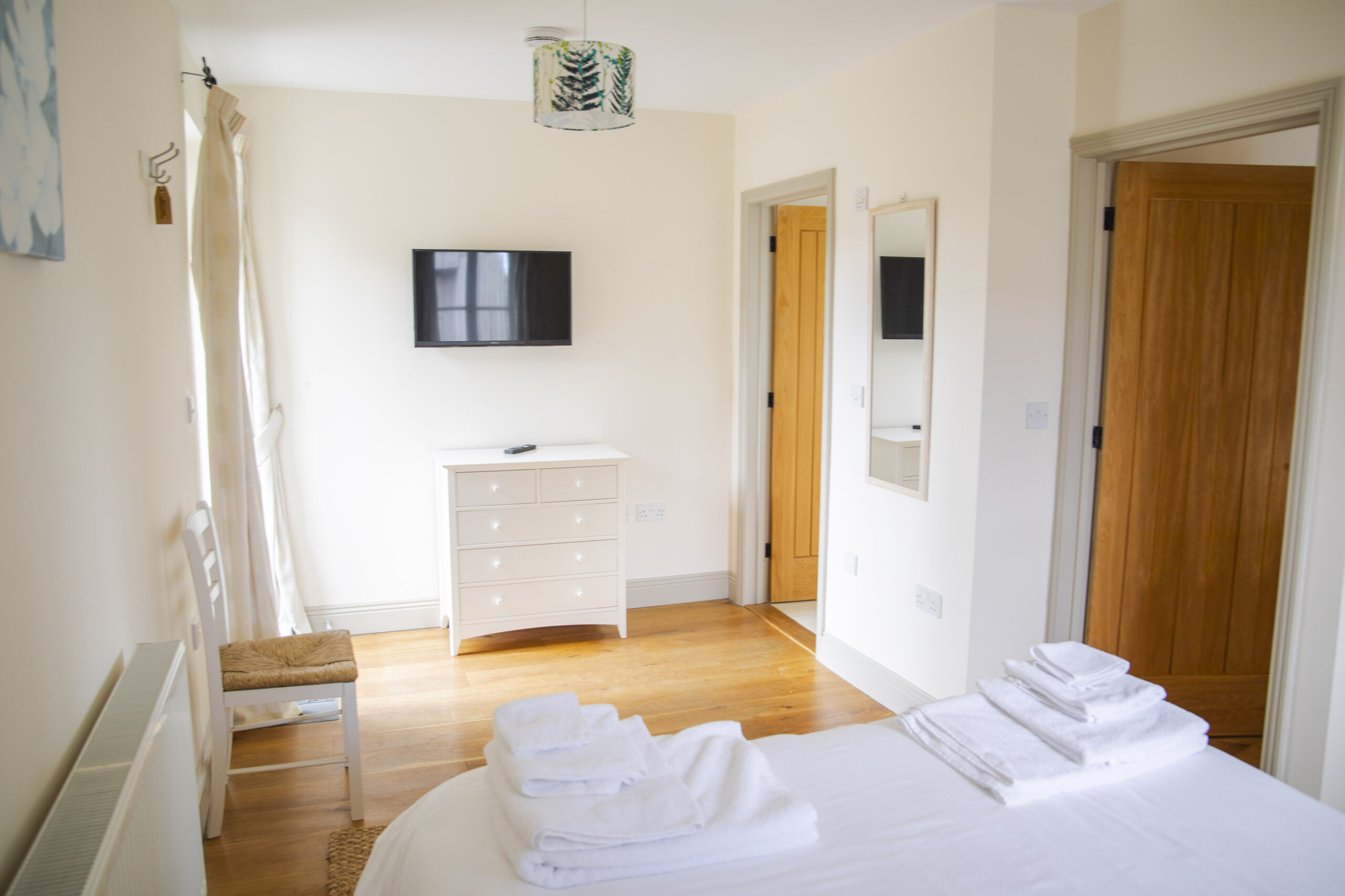 The spacious accommodation is all on one level, a comfortable living room with a wall-hung flat-screen smart television, a welcoming wood-burning stove, the dining area, the fitted and well-equipped kitchen area, and gas hob and electric oven, fridge/freezer, dishwasher, washing machine and microwave. Throughout, Oak flooring continues into the comfortable double bedroom with a 5ft double bed, with a fully tiled en-suite bathroom, bath, shower above, toilet, and wash hand basin.
