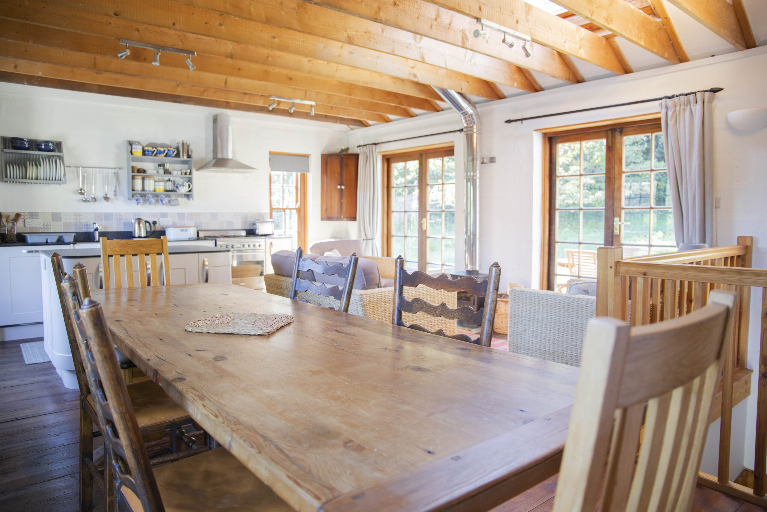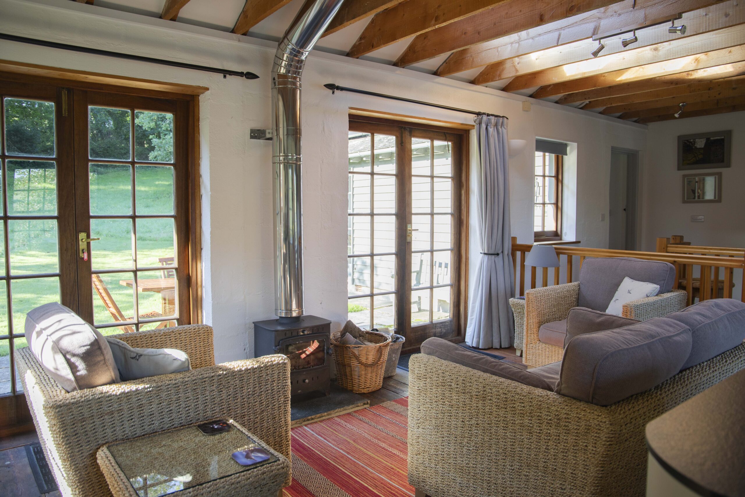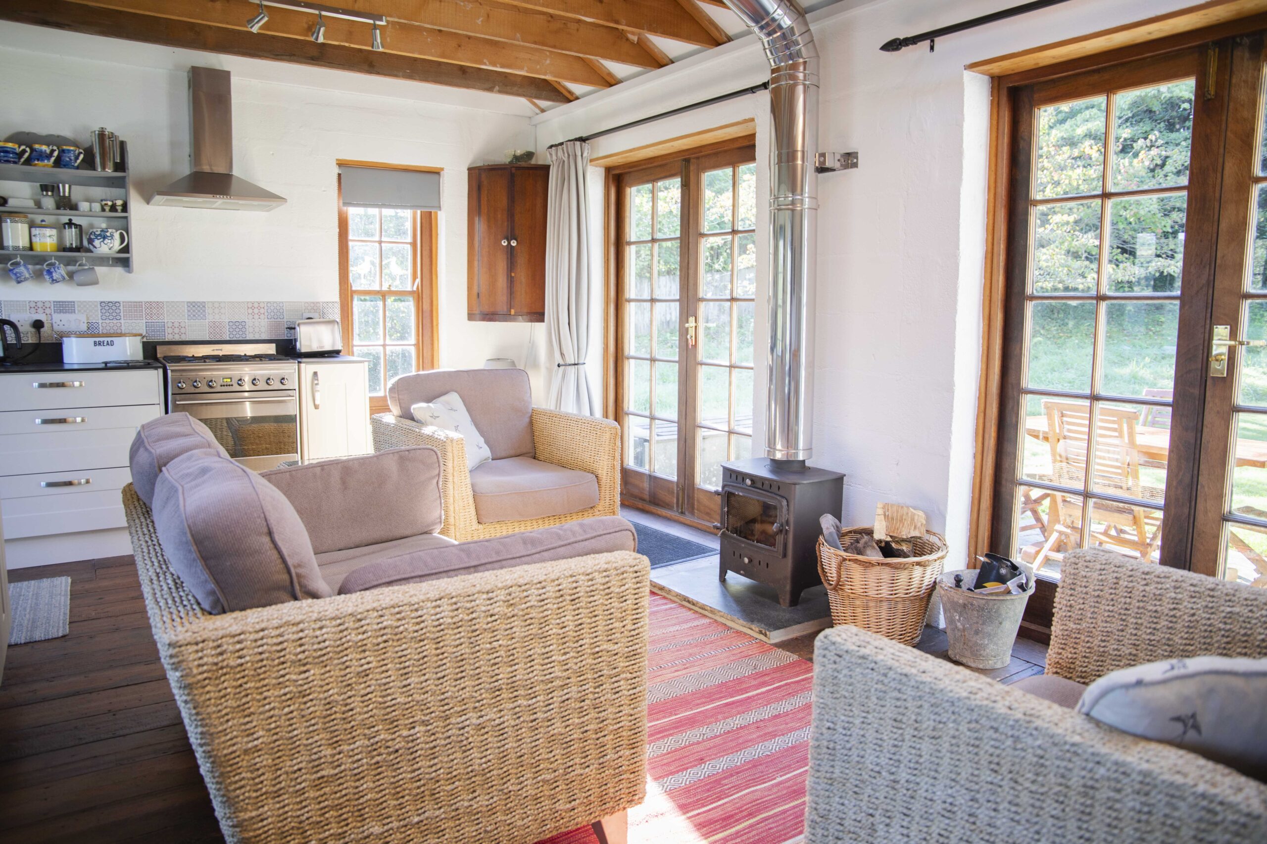 On entering The Boat House is a staircase leading up to the main living areas. At the top of the stairs is the open plan living room with a modern kitchen and dining area. The kitchen has a large built-in fridge freezer, dishwasher, microwave, built-in electric oven, and gas hob. French doors lead out onto the patio with large slate slabs with tables and chairs perfect for al fresco dining. The large lawn & wildflower meadow stretches away from the terrace. In the sitting area are comfortable sofas and wood-burning stove, wall mounted colour television and DVD player. By the dining table are french doors leading out onto the balcony with views of the creek.