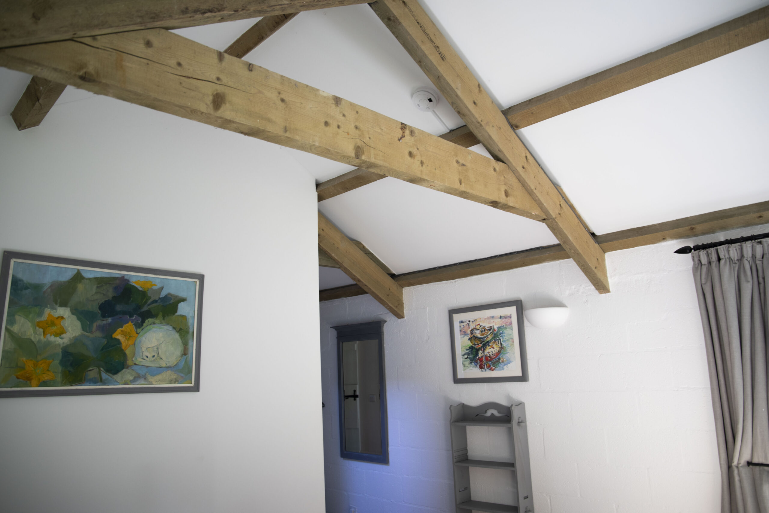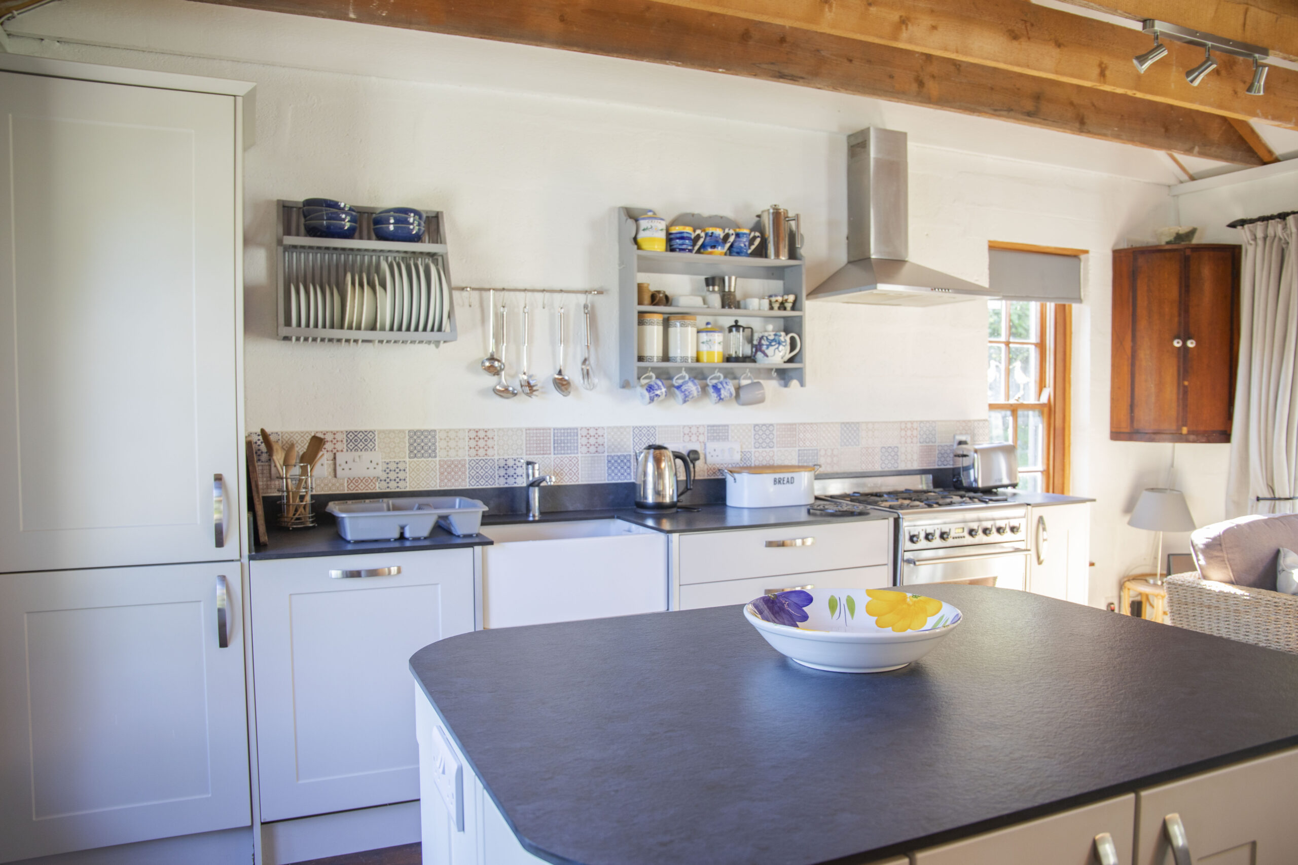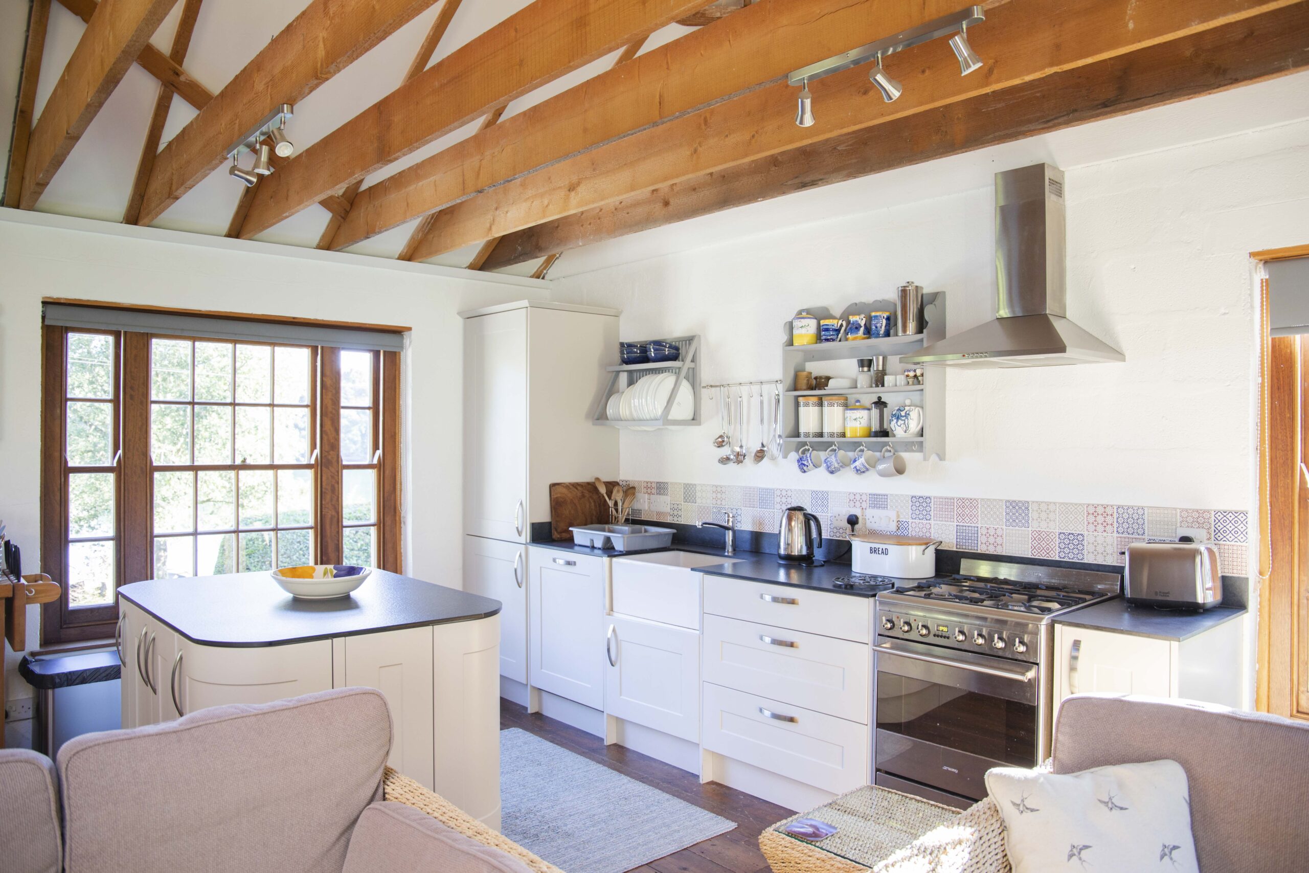 On entering The Boat House is a staircase leading up to the main living areas. At the top of the stairs is the open plan living room with a modern kitchen and dining area. The kitchen has a large built-in fridge freezer, dishwasher, microwave, built-in electric oven, and gas hob. French doors lead out onto the patio with large slate slabs with tables and chairs perfect for al fresco dining. The large lawn & wildflower meadow stretches away from the terrace. In the sitting area are comfortable sofas and wood-burning stove, wall mounted colour television and DVD player. By the dining table are french doors leading out onto the balcony with views of the creek.