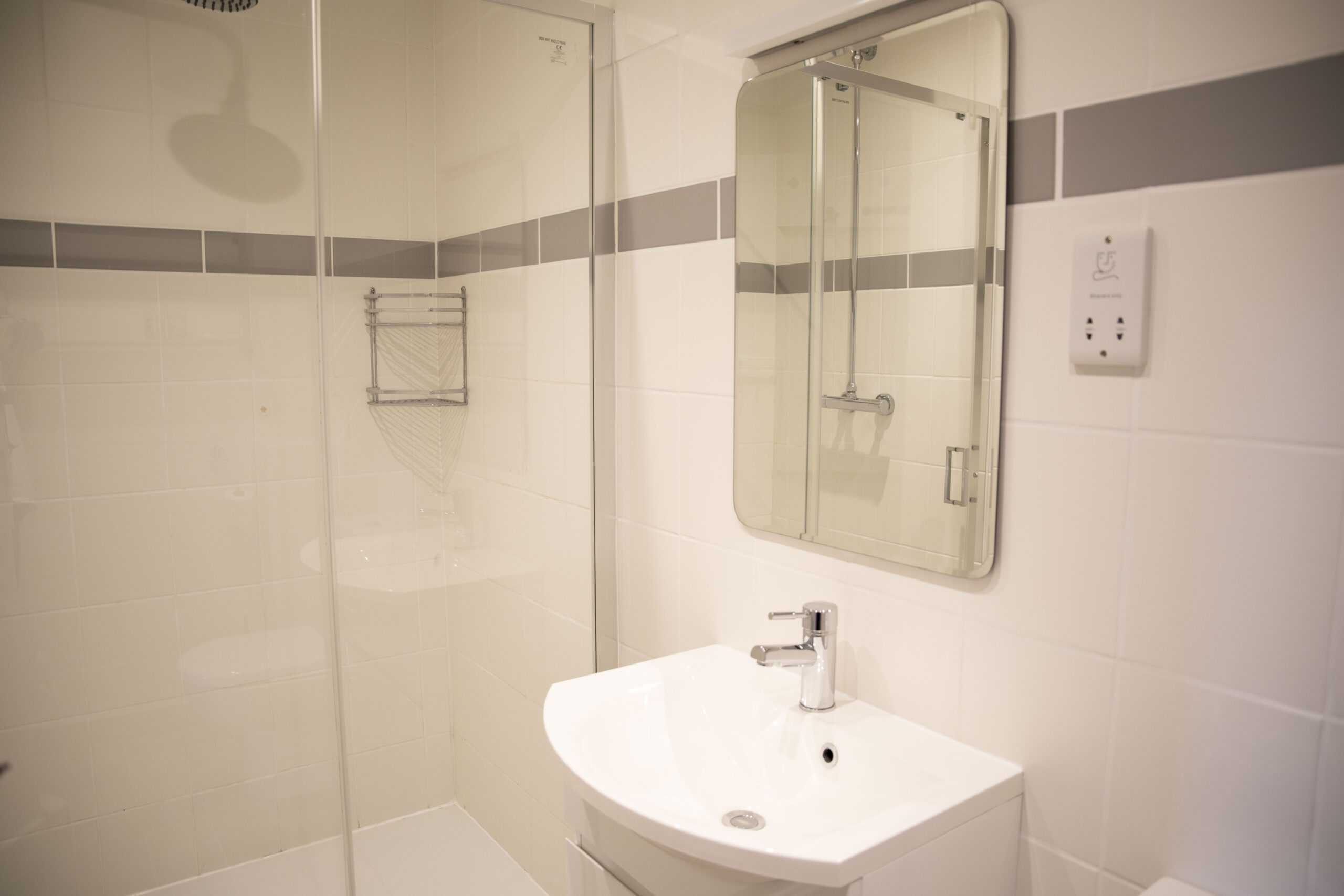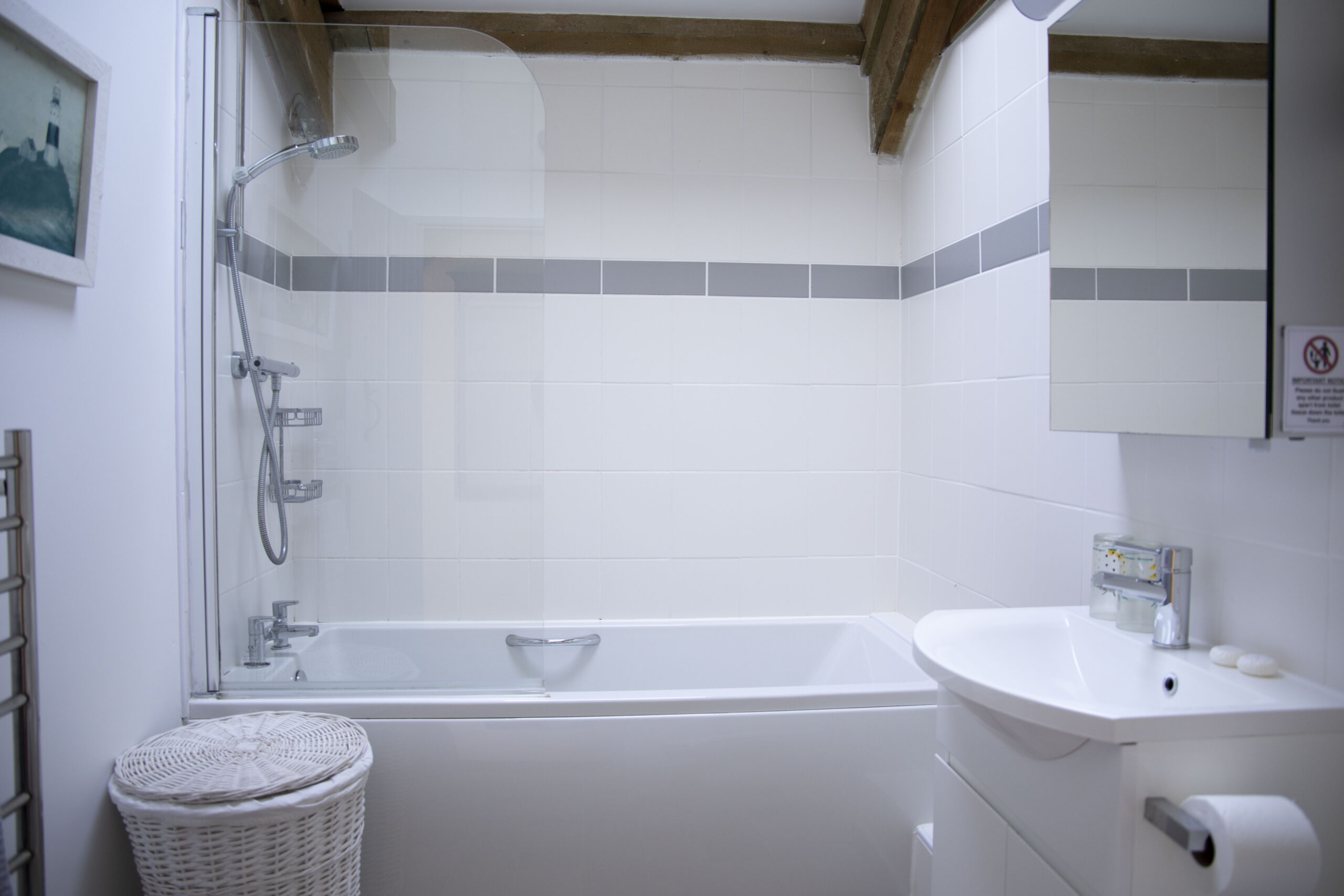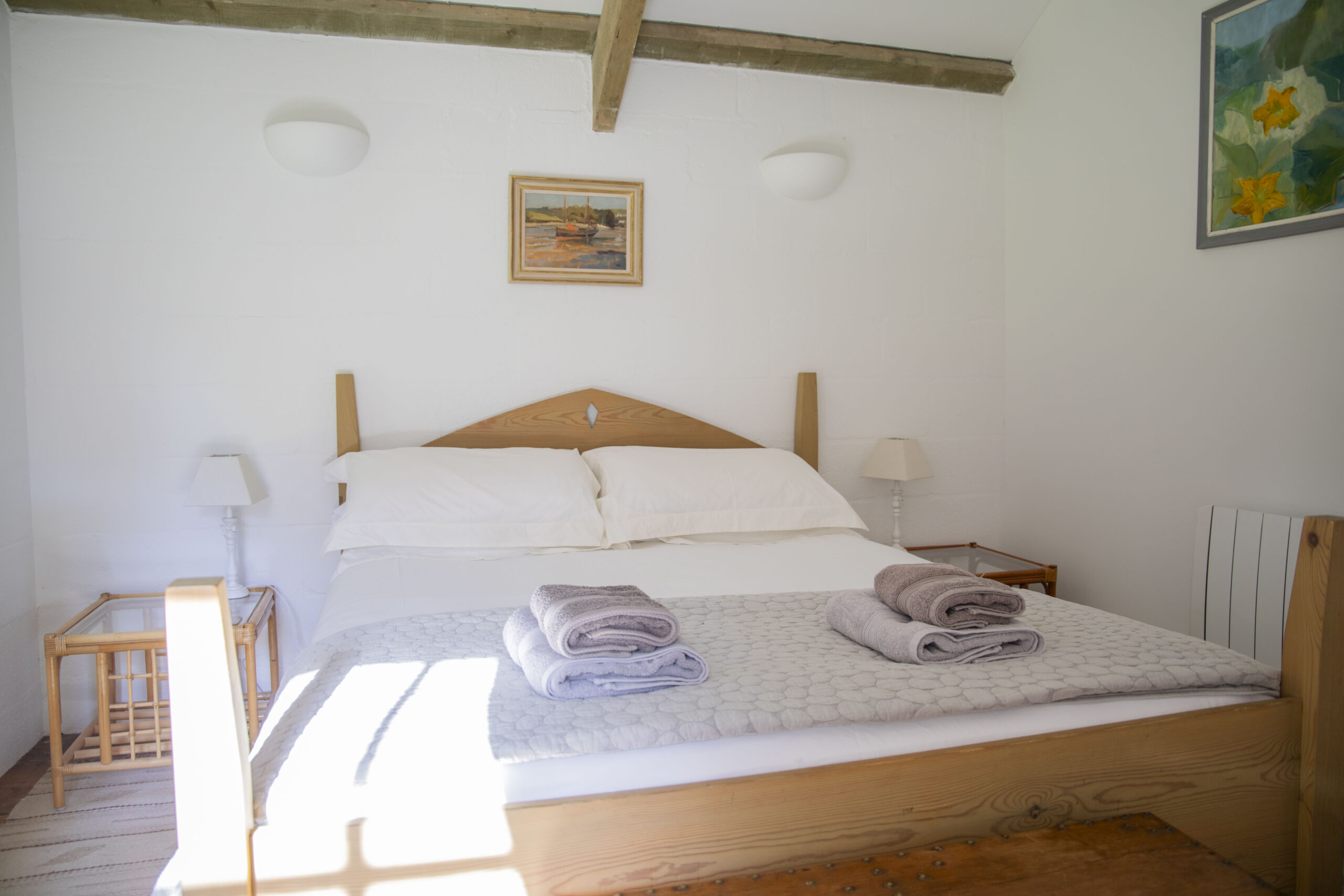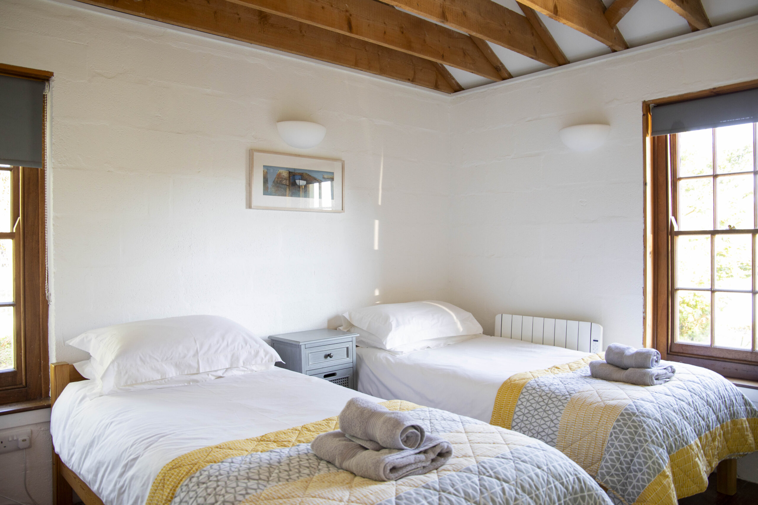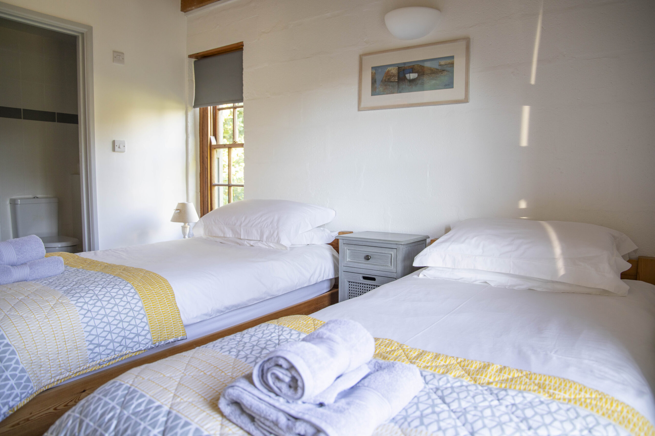 There are two bedrooms on this floor: one king-size double with en-suite bathroom, bath with shower above, toilet, and wash hand basin. The second bedroom has twin beds and an en-suite shower room with a toilet and hand basin.